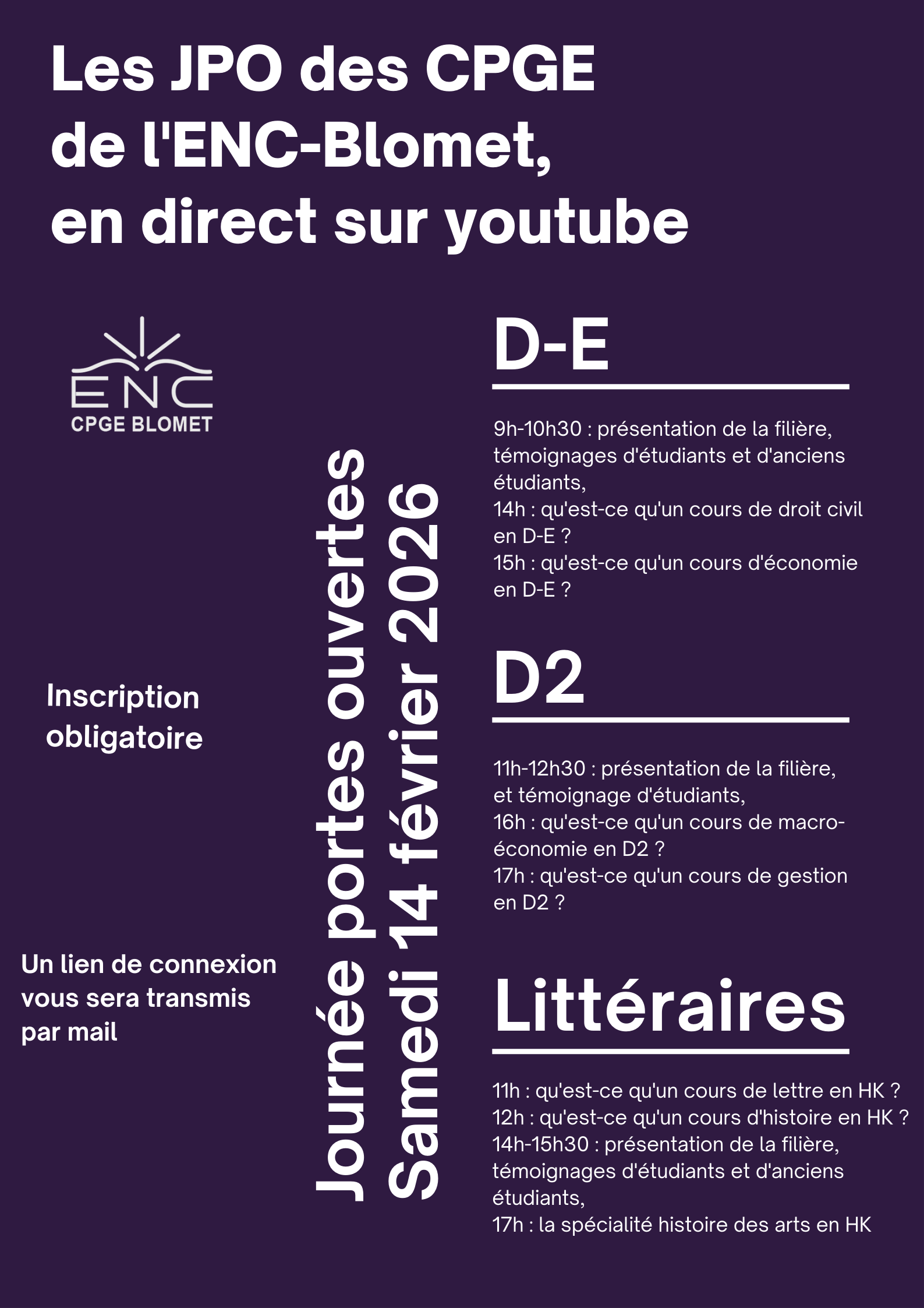 Samedi 14 février 2026, de 9h à 18h, vous aurez la possibilité de rencontrer, dans nos locaux, au 3,rue Barthélémy, des étudiants et anciens étudiants, des professeurs ainsi que les responsables pédagogiques de nos classes préparatoires.Afin de vous accueillir au mieux dans nos locaux, il est nécessaire de s’inscrire aux différents
